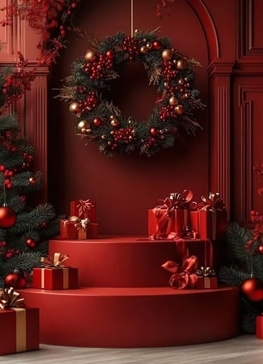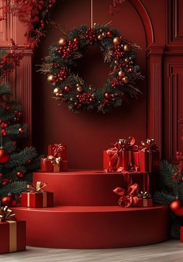 Rojos y verdes clásicos se mezclan con detalles elegantes, creando un espacio cálido, sofisticado y perfecto para retratos familiares.